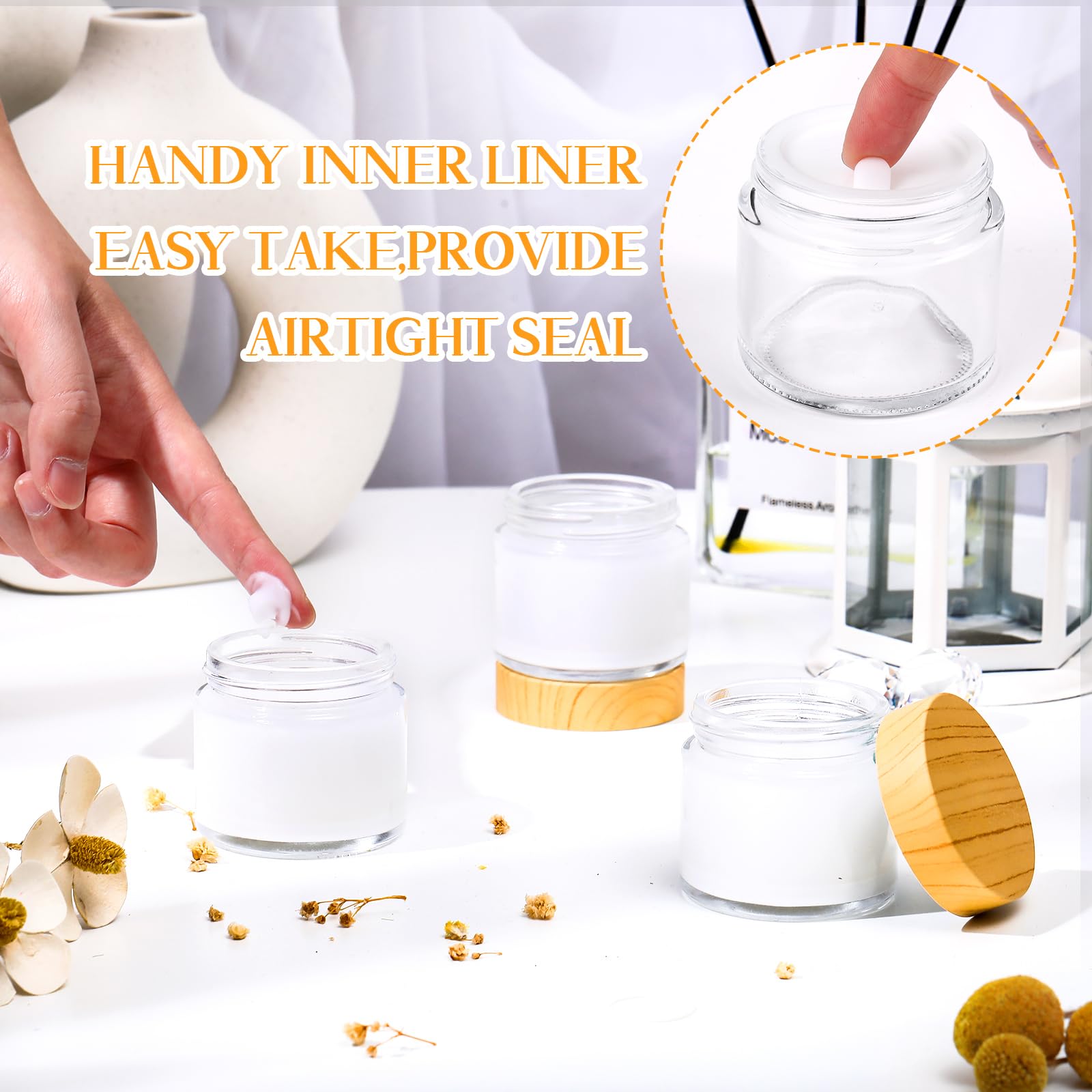 Details: Features: Reliable and durable: The glass lotion jars are built from sturdy, quality glass which ensures good preservation and longevity for the contained items. The construction of the jars allows them to withstand impacts and accidental drops, making them ideal for both transport and long term storage. Reusable and easily customizable: With 24 pieces included, the mini glass jars with lids provide reliable sealing and leakproof performance. The white labels further enhance usage convenience, allowing you to sort and customize the jars as per your needs. Besides storing cosmetics and trinkets, these jars can also function as candle or candied fruit holders. They are not just reusable but also suitable for various DIY projects. Specifications: Clear glass jars: Material: glassColor: clearSize: about 2.17 x 2.05 inches/ 5.5 x 5.2 cmCapacity: about 2 ozLids: Material: plasticColor: woodgrain colorHand pull inner covers: Material: plasticColor: whiteLabels: Material: waterproof PVCMain color: whiteSize: Square labels: about 0.98 x 1.57 inches/ 2.5 x 4 cmRound labels: about 1.5 inches/ 3.8 cm in diameterPackage includes: 24 Pcs 2 oz clear glass jars with lids24 x Foam gaskets24 x Hand pull inner covers80 x Labels (4 sheets)Notes: Manual measurement, please allow slight errors on size. The color may exist a slight difference due to different screen displays. The glass material is fragile, please handle it with care during use.