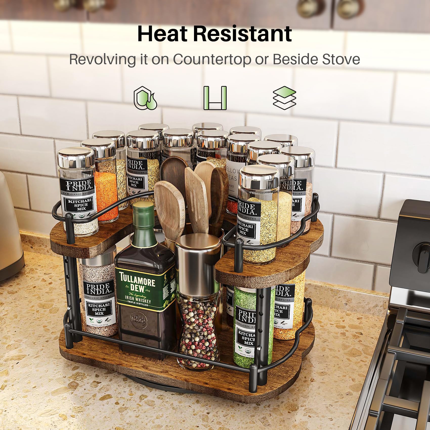 - Revolving in the Wall-Mounted Cabinet: Are you afraid of falling down the spices jars from the top cabinet? The 2tier spice rack is a great solution to take spices jars deep inside the wall-mounted cabinet. With a simple spin, the inside cabinet spices come closer to you for an even better view and are easy to take out.