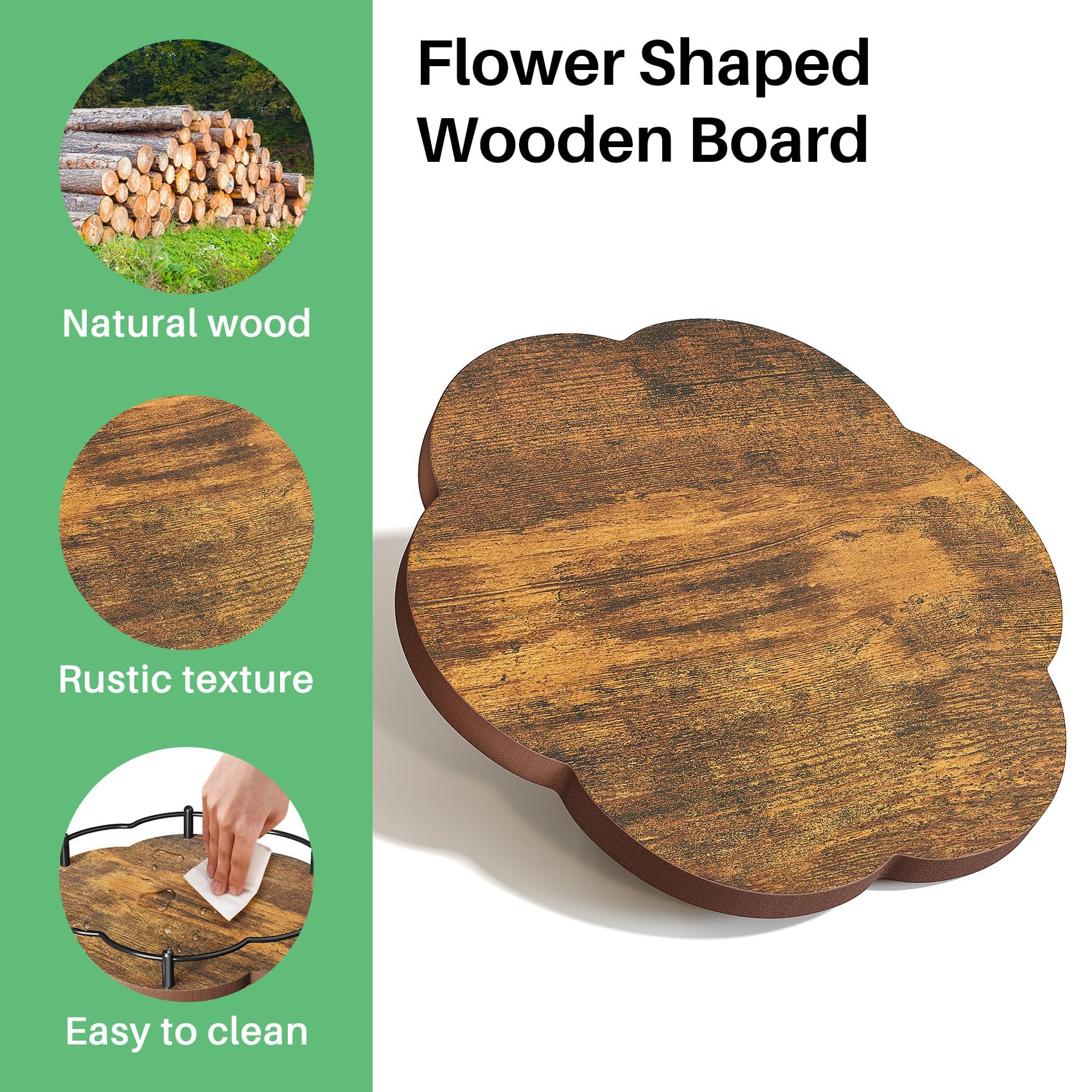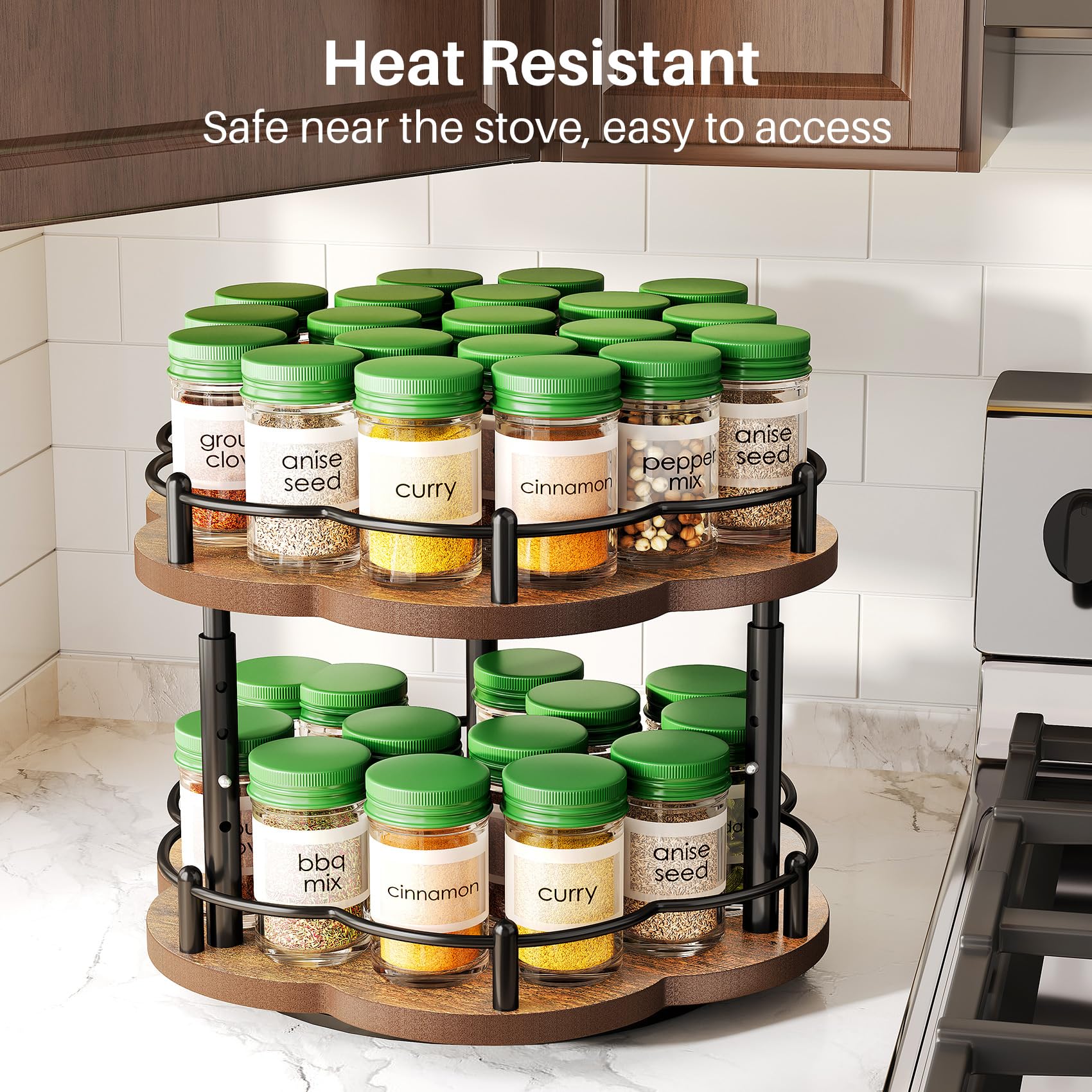 - Durable Wood Construction: The table surface of this Lazy Susan spice rack is crafted from FSC-certified wood, offering enhanced sturdiness compared to plastic and superior heat resistance compared to metal. The natural wood material is easy to clean, durable, and perfect for use near stoves.