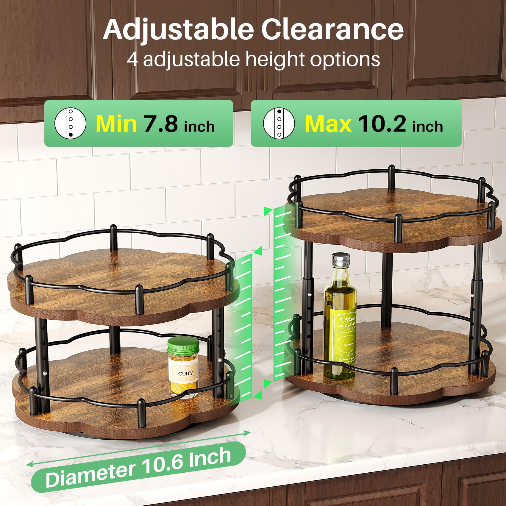 Lazy Susan Spice Rack Organization for Cabinet - 2 Tier Adjustable Height Lazy Turntable Spice Organizer for Kitchen Countertop & Pantry, Wood 10 Inch Seasoning Storage, Black