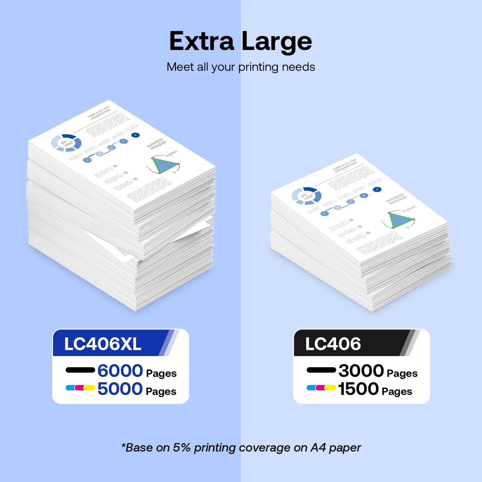 - Pages Yield: Up to 6000 Pages per LC406 Black XL ink cartridge, 5000 Pages per LC406XL Color Standard ink cartridge (5% coverage).