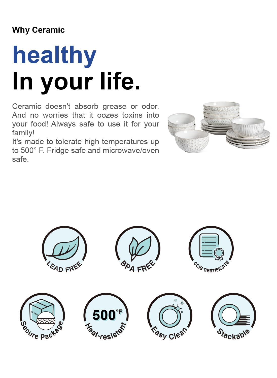 - No Lead And No Cadmium: LE TAUCI ceramic dishes dinnerware sets are quality approved stoneware, Whitnout any food residue or odors. Chip-resistant and more sturdy! Dishwasher, Microwave And Oven Safe