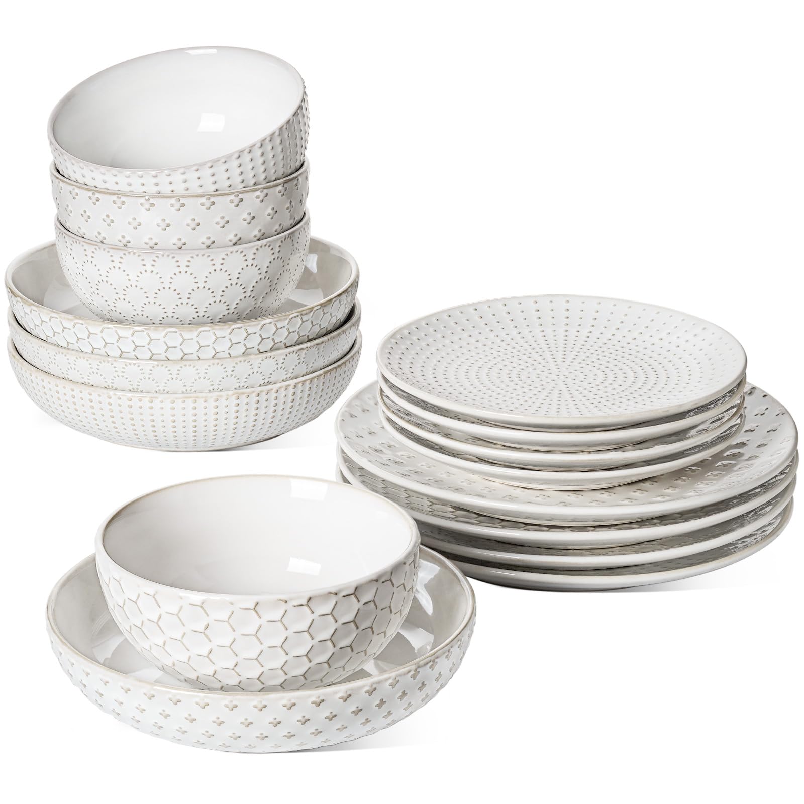 - Different Embossment: Both bowls and plates are embossed with different patterns. The outside of the dinnerware set is embossed and the inner glaze is a smooth ceramic surface. Please note: Due to the bump of embossed surface, it is not suitable for using knives on the plates or for serving food with too much sauce