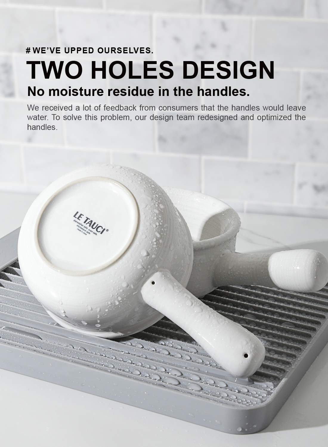 - Dual-Drain Handles: Two vent holes prevent water trapping so handles dry fast after dishwashing eliminating moisture odor or mildew and keeping soup crocks hygienic