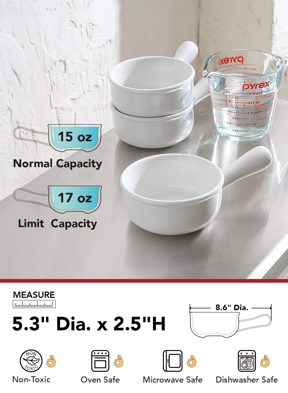 LE TAUCI French Onion Soup Bowls, 15 Ounce Ceramic Soup Bowls with Handles, for Chili, Beef Stew, Oven Microwave Dishwasher Safe, Set of 4, White