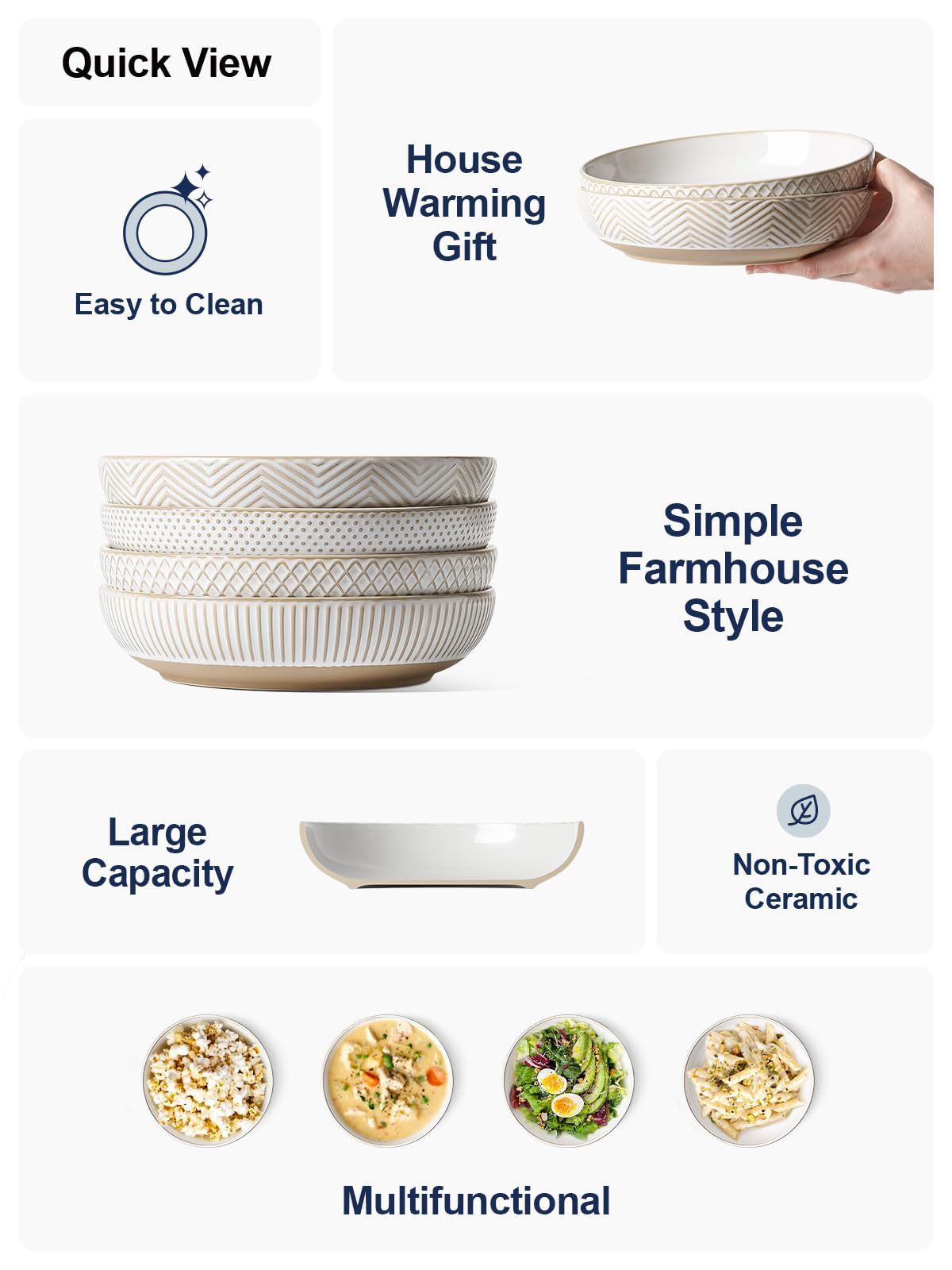 LE TAUCI Pasta Bowls 46oz, Large Salad Bowl, Ceramic Serving Plate, House-warming Wedding Present, Embossment Stoneware Bowl for Fruits, Noodle, Dinner - 9 Inch, Set of 4, Arctic White