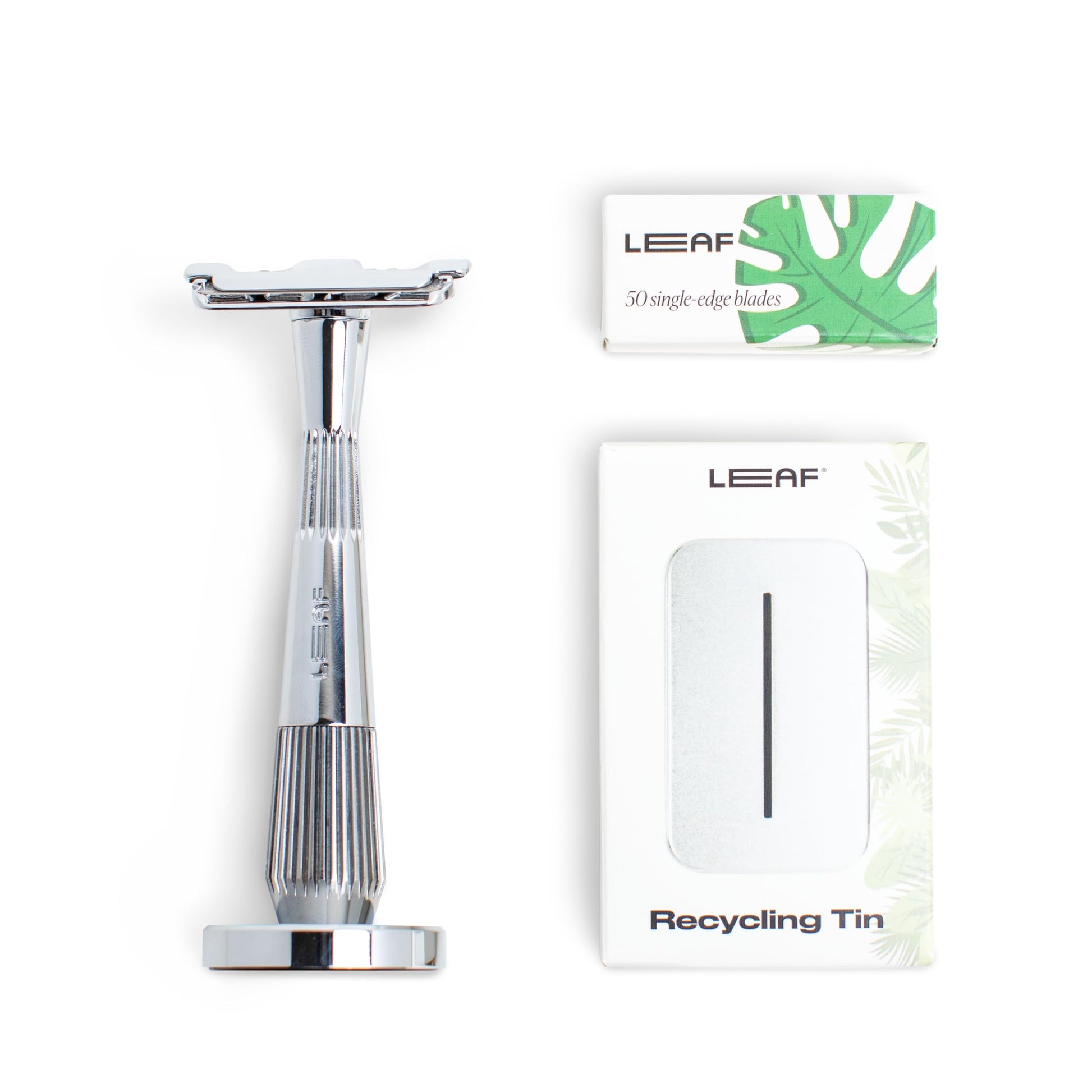 Leaf Shave | The Twig Razor Set, Chrome - Includes 1x Twig Razor, 1x Matching Stand, 1x 50-Pack of Single-Edge Blade Refills, and 1x Razor Blade Bank