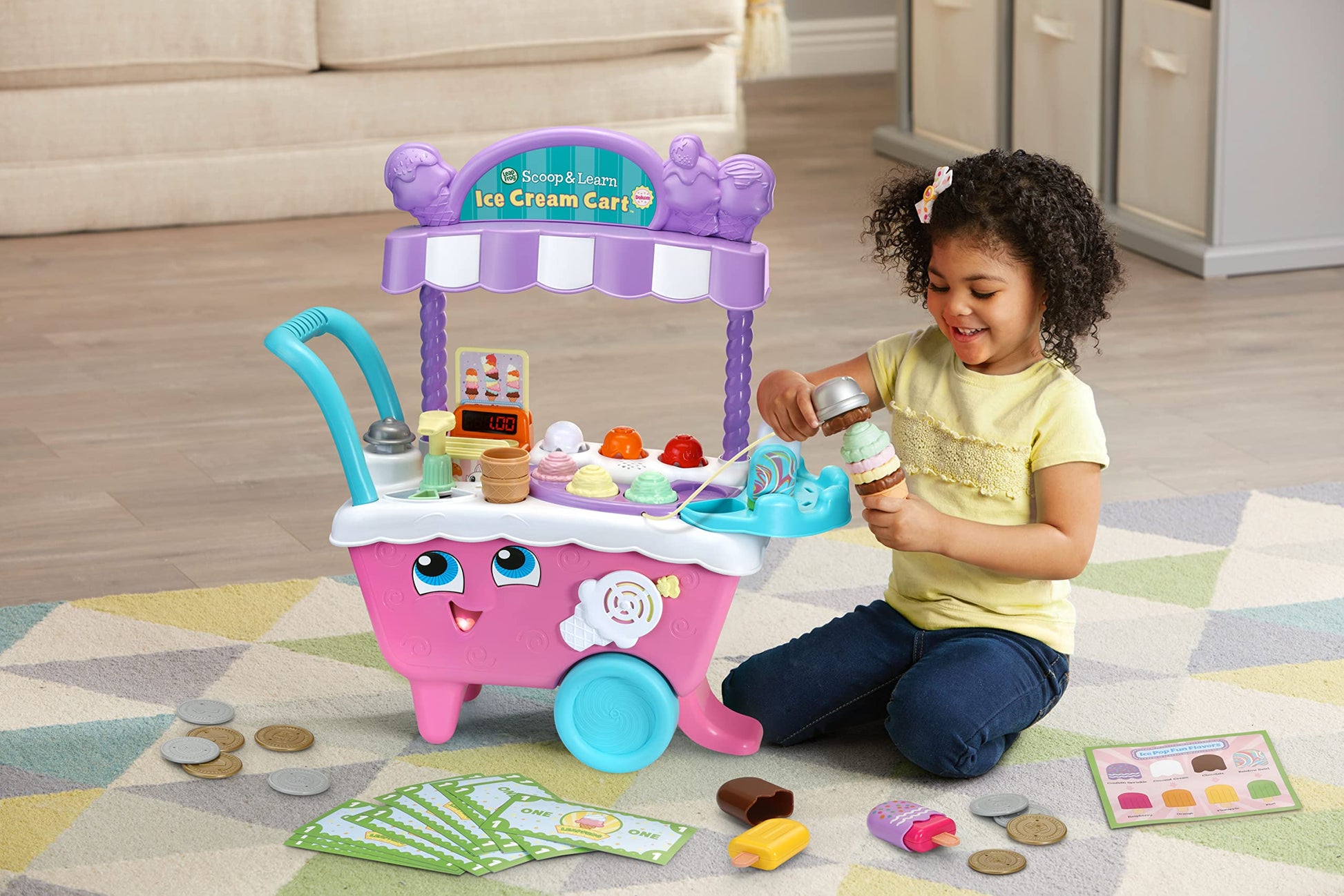 Details: Learning is sweet with the Scoop and Learn Ice Cream Cart Deluxe. Customers can order ice cream or ice pops in a variety of imaginative and tasty-looking combinations directly from your little one's ice cream stand. Choose from 4 flavors of ice cream and 3 ice cream toppings. Use the magic scooper to scoop up the ice cream and add toppings to build customer orders; the cart will recognize the colors and flavors. Pick out an ice pop from one of the 4 main flavors and choose one of 4 ice pop toppings from the ice cream stand. Press the pump to add pretend syrup to any tasty treat; count to 10 for flavor perfection. Select one of the 6 cute animal order cards and follow the ice cream order instructions to build memory and sequencing skills. Order’s up! Ring the bell to let customers know their order is ready. Pretend money is included for extra role-play interactions and to introduce counting. The Scoop and Learn Ice Cream Cart also includes playful phrases introducing colors, numbers, flavors and more. Put the ice cream, cones, toppings and ice pops into holders or put them in the 2 storage drawers. Roll the kids ice cream cart along to hear upbeat songs and music. It’s time for frozen treats! Intended for ages 2+ years. Requires 3 AA batteries. Batteries included.