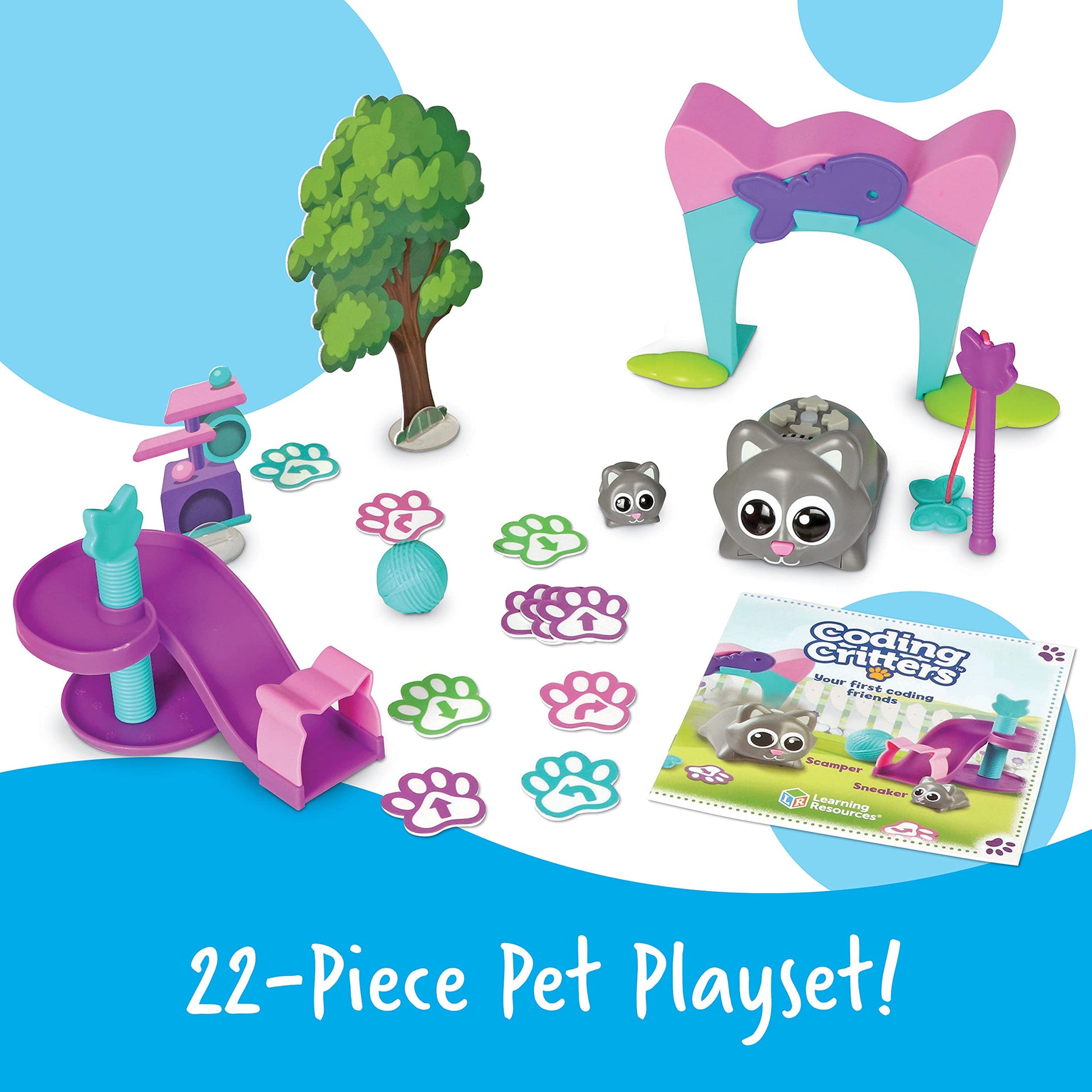 - TEACH SCAMPER & SNEAKER TO FETCH & MORE: Play fetch, hide and seek, and more with curious Scamper and sneaky Sneaker. 22 PIECES, ENDLESS PLAY: Design your own endless coding challenges with the 22-piece pet playset