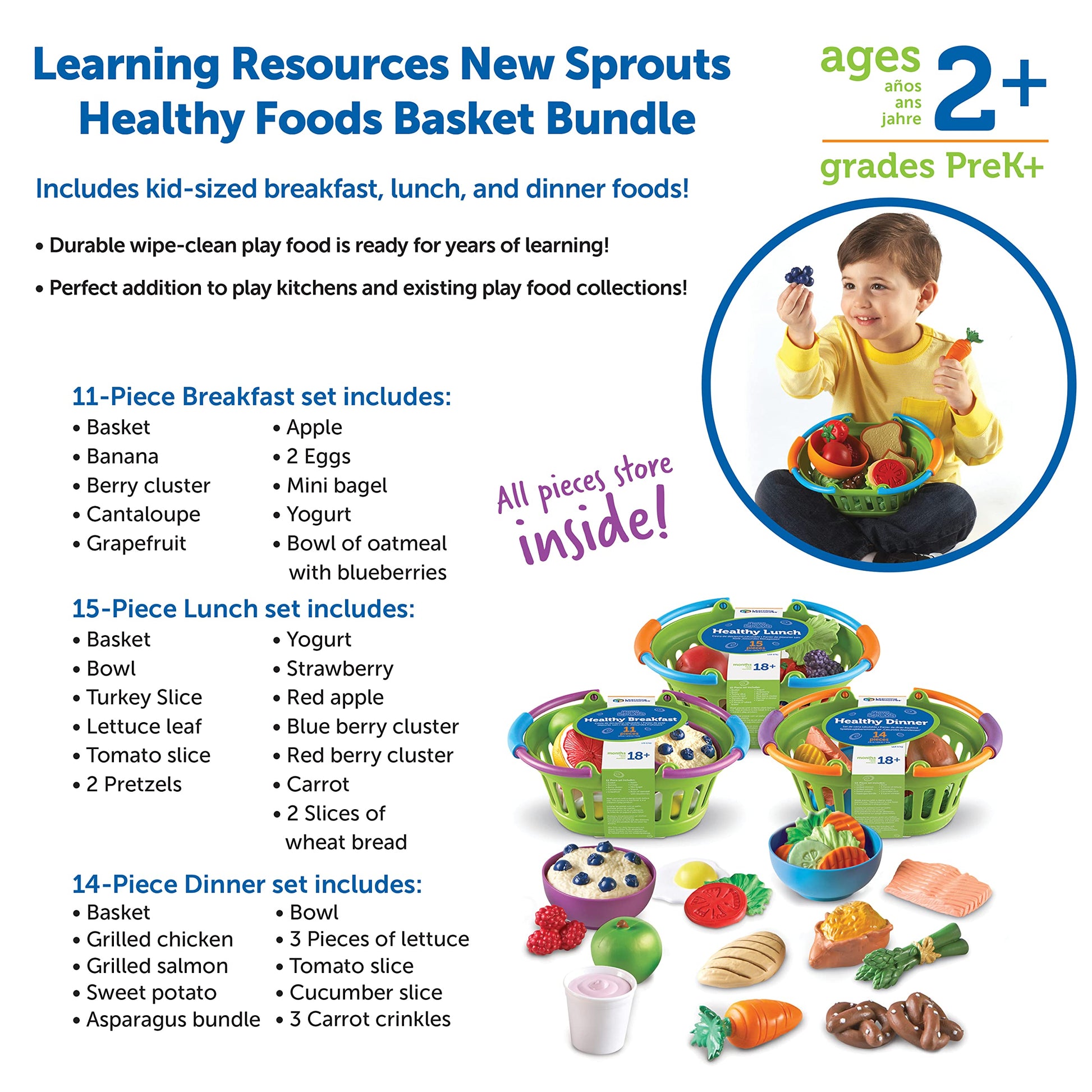 Details: Help children make good nutritional choices at every meal! Learning Resources New Sprouts Healthy Breakfast, Lunch, and Dinner Baskets are conveniently bundled together in this deluxe set. Learning Resources New Sprouts Healthy Basket Bundle (Breakfast, Lunch, Dinner) Features: 30 Play food pieces in soft, washable, crush-resistant plastic 3 Baskets. Ages 18 mos and up!