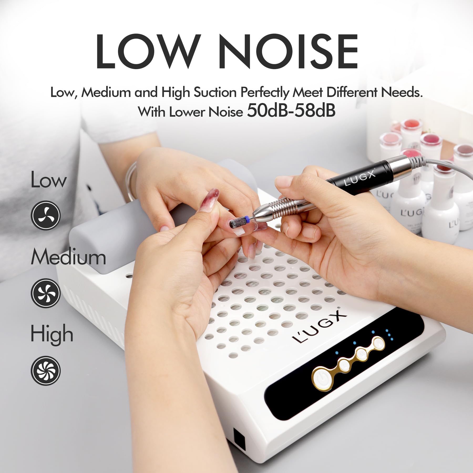 - 【Rechargeable & Portable】 This Nail Dust Collector from L'UGX is equipped with a large-capacity lithium-ion battery, which can be used for up to 8 hours after being fully charged. It is very convenient to use cordless anytime and anywhere. The best choice for nail art.