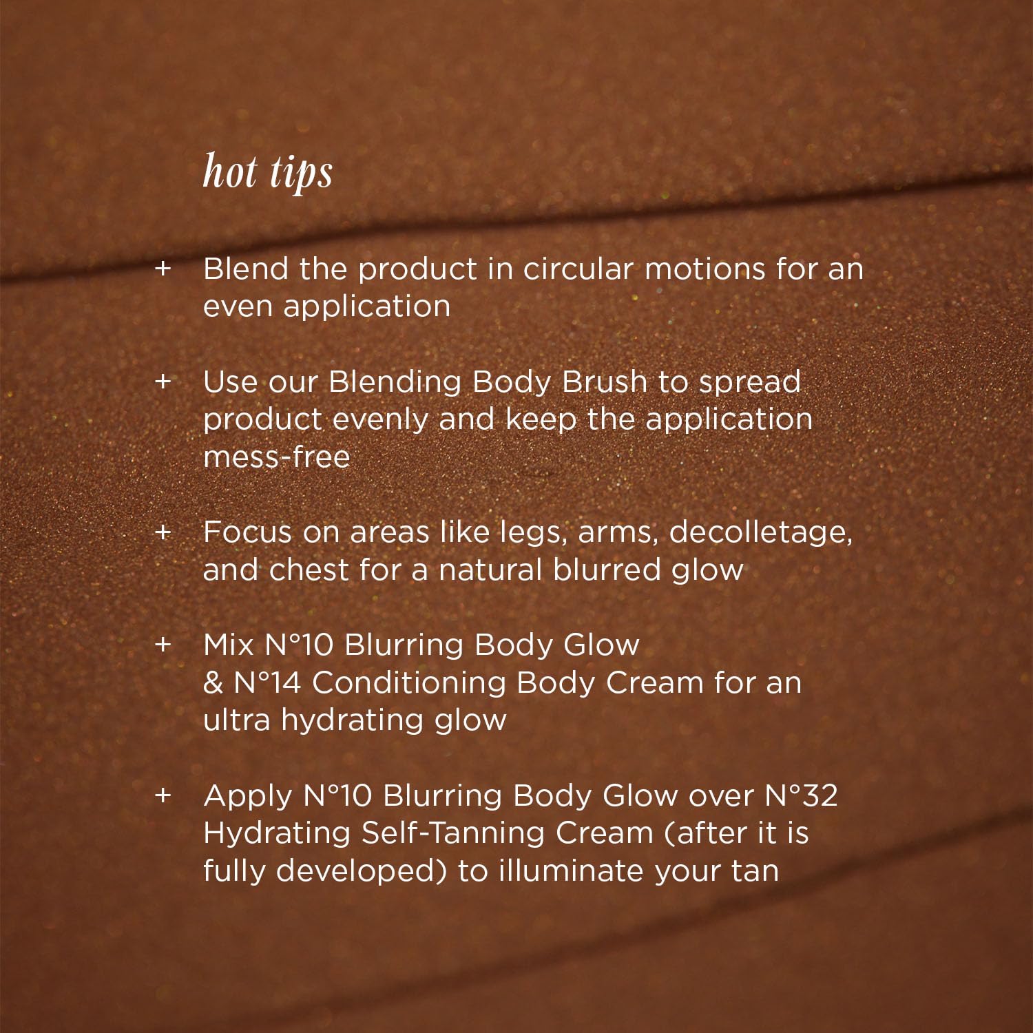 - Hot Tip: Apply N°10 shimmer body lotion over N°32 Hydrating Self-Tanning Cream (after it is fully developed) to illuminate your tan