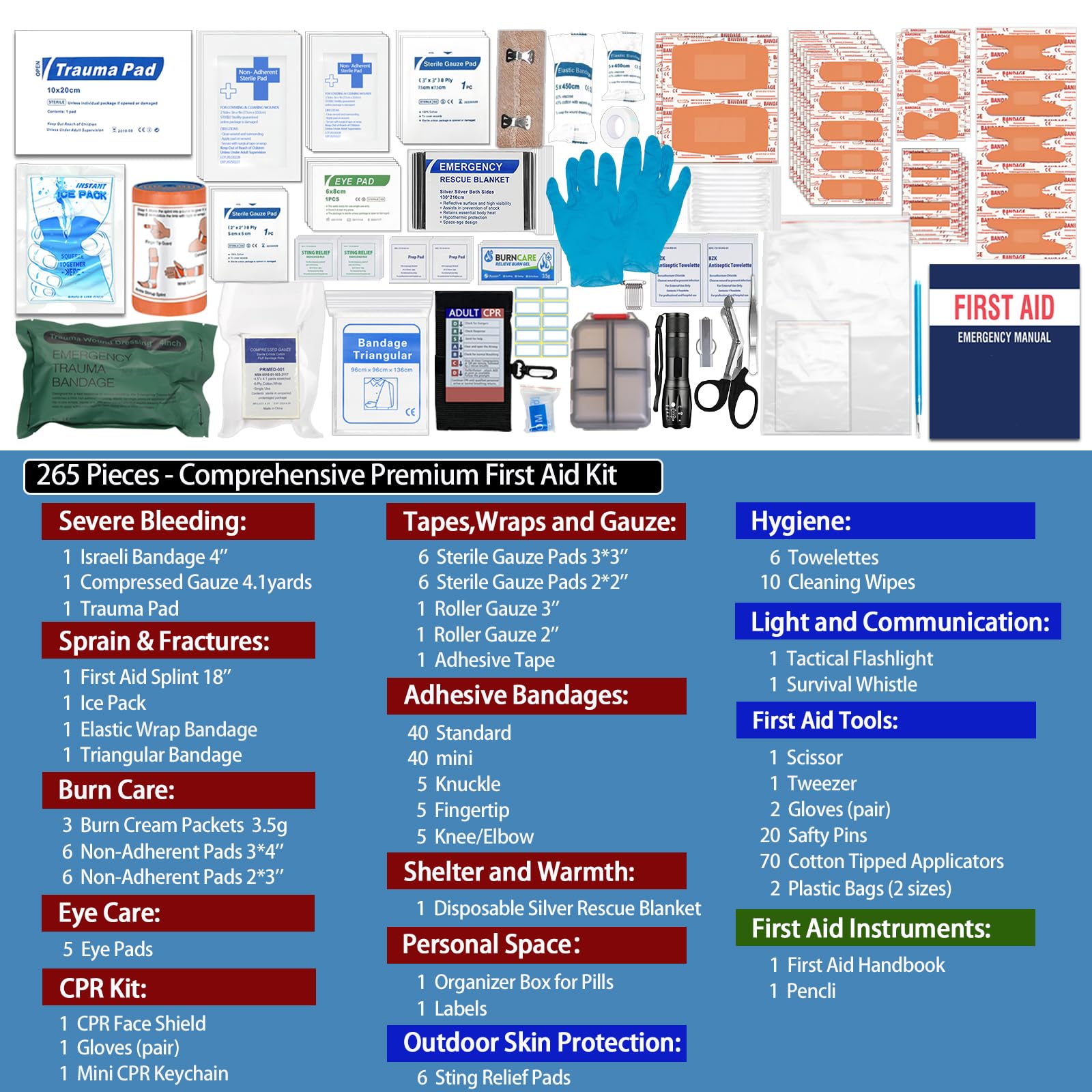 - 【Comprehensive First Aid Supplies】Include adhesive bandages in multiple sizes, suitable for covering small cuts, scrapes, and punctures. Sterile gauze pads and rolls, which are essential for dressing larger wounds and stopping bleeding. 265 first aid supplies for severe wounds, sprains, fractures, burns, fever, and hypothermia, making it a true lifesaver in critical situations