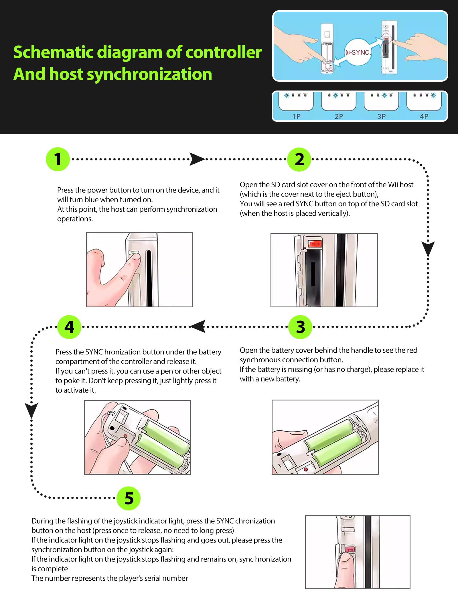 - 【Easy Pairing】① Insert 2pcs AA batteries (not included). ② Press the "SYNC" button on the wii controller and console separately. ③ If the connection fails, press the "SYNC" button on the console for 15 seconds to clear all connected controllers. ④ Then press the "SYNC" button on the wii controller and console again separately.