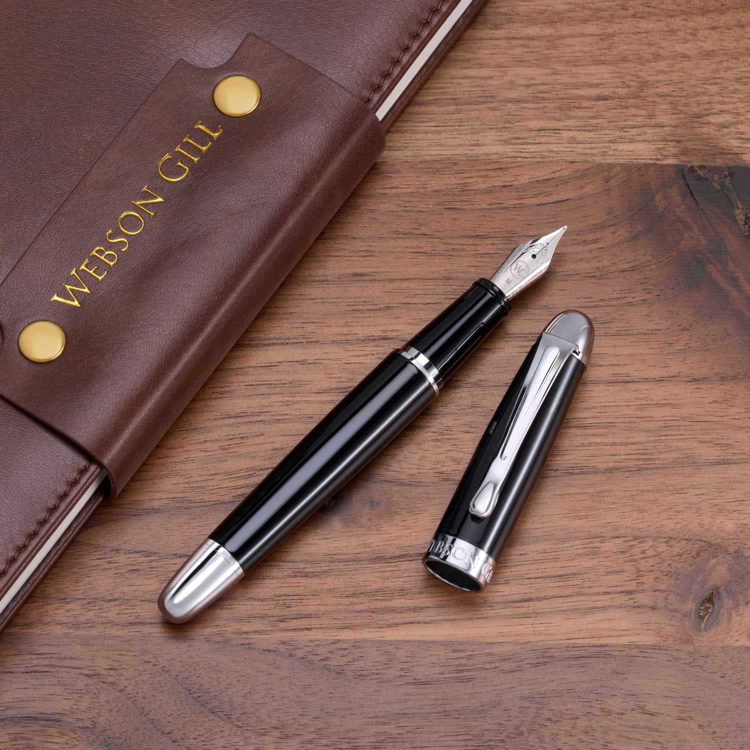 - The Boss fountain pen features elegant chrome accents on the cap, clip, and grip section, adding style and performance. The chrome detailing enhances the pen's premium look, creating a striking contrast against the high-gloss black resin body, resulting in a classic design.